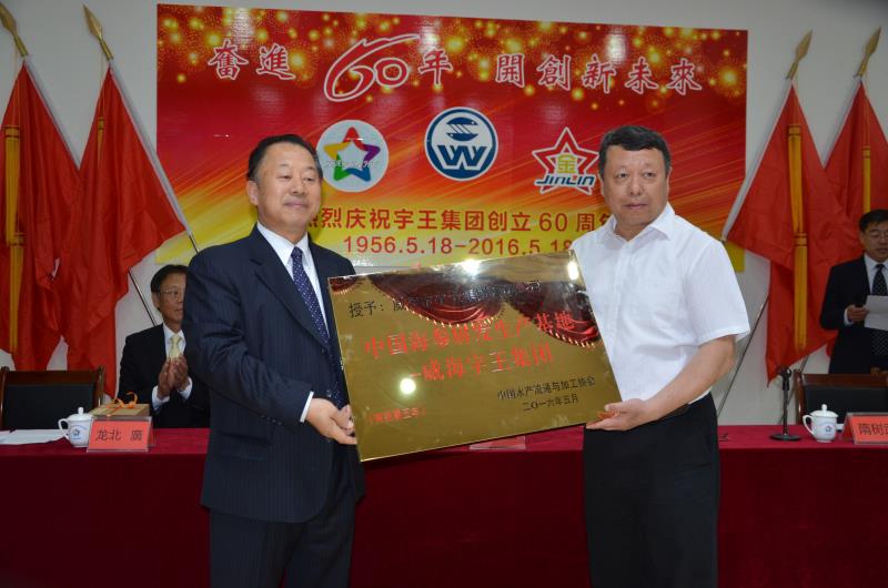 中國水產(chǎn)流通與加工協(xié)會(huì)秘書長邸剛代表行業(yè)協(xié)會(huì)為宇王集團(tuán)創(chuàng)立60周年表示祝賀,并向宇王集團(tuán)頒發(fā)了“中國海參研發(fā)生產(chǎn)基地”和“威海市宇王集團(tuán)愛之信商學(xué)院指定培訓(xùn)機(jī)構(gòu)”的牌匾,向宇王集團(tuán)合作客戶日本株式會(huì)社辻野、日本株式會(huì)社丸福食品授予“中日友好合作最佳誠信商社”證書。