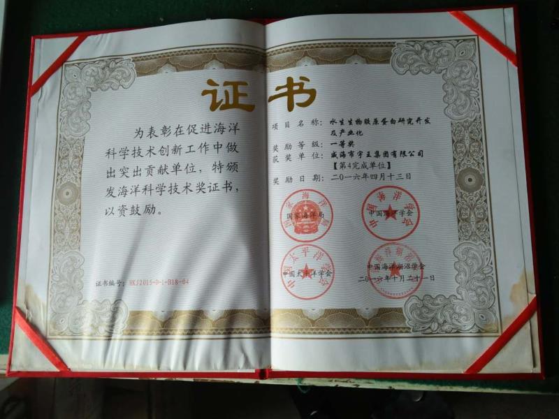近日,國(guó)家海洋局、中國(guó)海洋學(xué)會(huì)等部門對(duì)在促進(jìn)海洋科學(xué)技術(shù)創(chuàng)新工作中做出突出貢獻(xiàn)的單位進(jìn)行表彰,威海市宇王集團(tuán)“水生生物膠原蛋白研究開發(fā)及產(chǎn)業(yè)化”項(xiàng)目榮獲一等獎(jiǎng),也是全國(guó)僅有的三個(gè)獲獎(jiǎng)企業(yè)之一。同時(shí)宇王集團(tuán)研發(fā)的“魚鱗膠原蛋白肽粉”、“海參肽粉”、“海參飲品”、“魚鱗膠原蛋白”產(chǎn)品被中國(guó)水產(chǎn)流通與加工協(xié)會(huì)水產(chǎn)資源高值化利用工作委員會(huì)授予“創(chuàng)新優(yōu)秀產(chǎn)品”稱號(hào)。