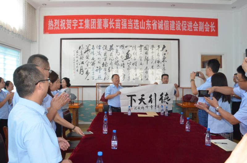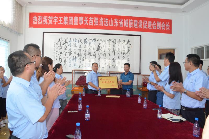 威海市宇王集團榮獲山東省誠信建設促進會副會長單位,宇王集團董事長苗強當選省誠信建設促進會副會長。17日上午,在宇王集團會議室進行了授牌儀式。